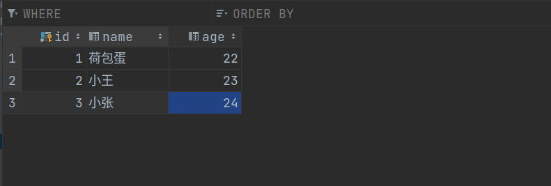 <== Row: 3, 小张, 24, null, null, null, null
