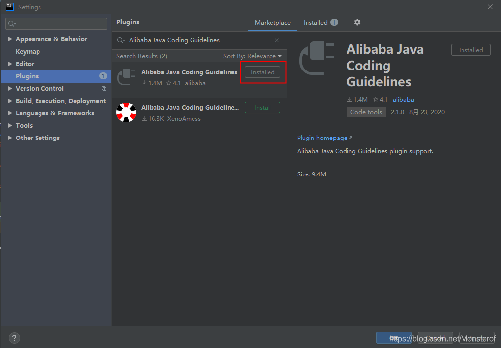 首先ctrl+alt+s打开设置,在Settings…找到Plugins(插件)搜索alibaba—>Alibaba Java Coding Guidelines—>lnstall(安装)